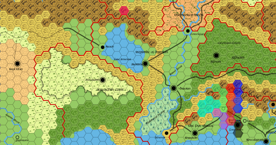 ワーマシン用に24マイルマップで各PC領土色分けしてみたんだけど、